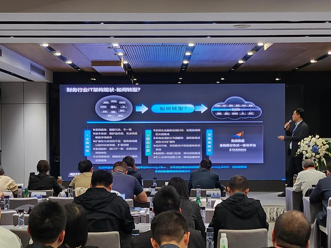 东升国际 东升代表讲师郭钰以《昆仑与东升国际 东升ESB解决方案助力财务行业创新与架构转型》为主题作发言分享。他深入剖析了当前财务行业IT架构面临的挑战,包括系统孤岛、技术老旧、扩展性不足等问题,并提出了基于企业服务总线(ESB)和微服务架构的转型方案。